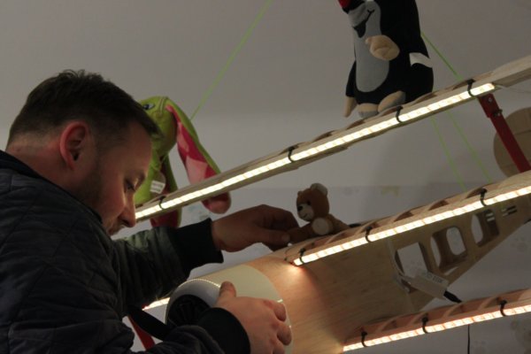 Az előző bejegyzésben leírt gyerekszoba “gyártást” követően be lehetett rendezni a szobát. Fiú babaszoba lévén a helyiség fénypontja nem lehet más, mint a férjem által gyűjtött és összerakott balsafa repülő (váz), amit még évekkel ezelőtt járatot. Havonta jöttek a darabjai a postával, amik a kezdeti lelkesedés után már csak a helyet és a port fogták. 😀 Adta hát magát az ötlet, hogy ha már nem fog repülni… (mert hogy egy távirányítós, benzin motoros modellről van szó) akkor legyen ékes dísze kisfiúnk szobájában felfüggesztve.