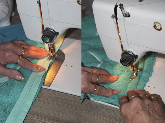 Ezután a törzs részét, amiből a párna lett, formára vágni. Most jöhet a cipzár varrása a kifordított! anyagra. Mivel zsebes volt a pulcsi, azt is bevarrtuk mikor a szélein mentünk át a varrógéppel, megerősítve a tartását majd a párnának.