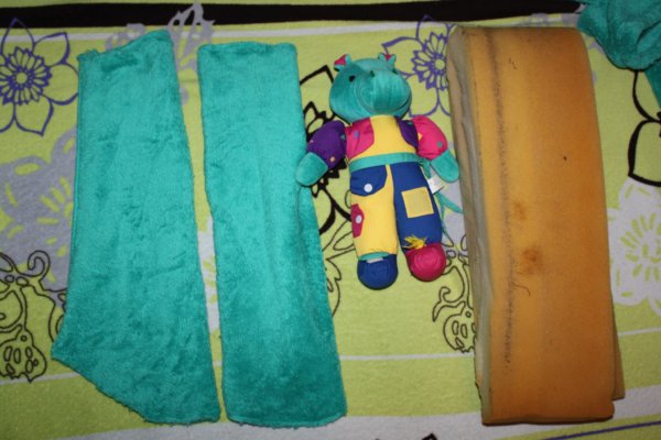 Majd a nyaka körül összevarrtam (én!) az anyaggal. A másik végén pedig a szivacs csíkot húztam bele.
