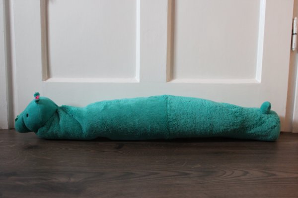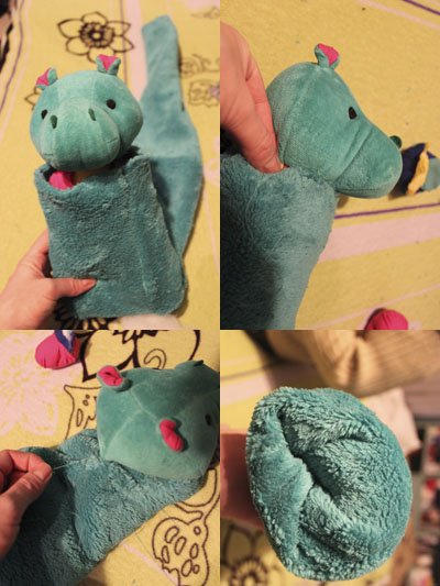 Hogy ne menjen kárba a pulóver ujja se, kitaláltam hogy csináljunk belőle az ajtó vagy ablak alá huzatfogót. De nem ám egy hétköznapi uncsi huzatfogóra kell gondolni, hanem a most “divat” plüssfejes verzióra gondoltam. Először kerestem hozzá egy színben passzoló plüssjátékot amit nem sajnáltam szétvágni… mert hogy csak a feje kellett hozzá. 😀 Na ezt a megnemmondommilyenállatot nem sajnáltam mert csúnya is volt, meg csörgött is.