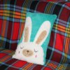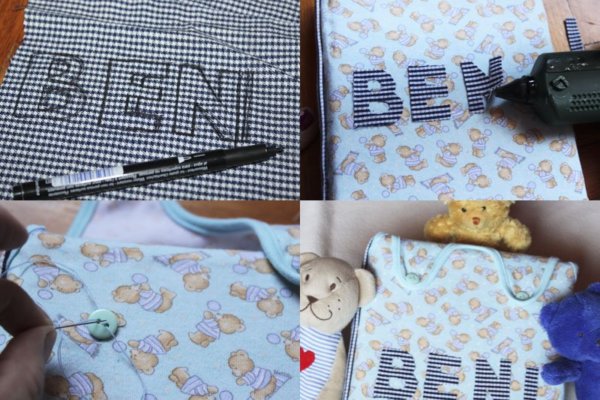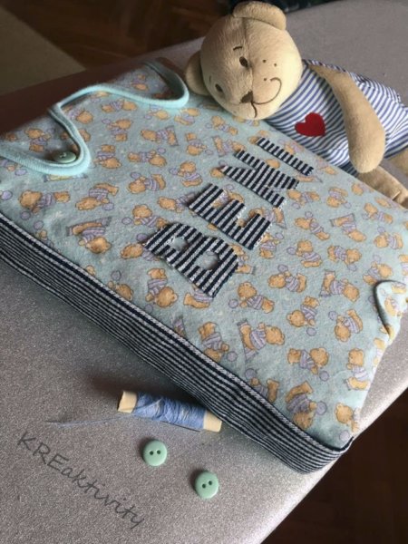 5. Ezek után jöhet a díszítés. A ruhaanyagból a nevét is kivágtam majd ráragasztottam, nem varrtam 😛 És végül a gomb varrása következett… ami a legnehezebb feladat volt ebben a projektben. 😀