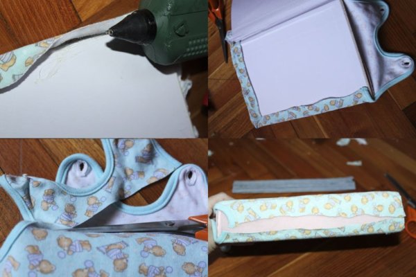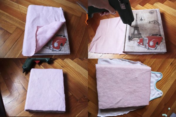 3. Egy kis bélés anyagot is felhasználtam a tipegő alá, hogy puha és pufibb legyen a ‘kötet’. Ezt gondosan ráhajtva olvadékragasztóval rárögzítettem.