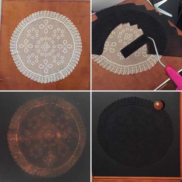 Először is áttakarítottam mosószeres vízzel szegény viselt alanyomat, bárszekrény mivolta miatt ragadt is. Ezután csiszolás 80-as vászonnal sarokcsiszolóval, és gittelés ezerrel következett. Az ajtók rossz állapota miatt muszáj volt lecsiszolni a lakkot és persze azért is mert így jobban tapadt rá a vízbázisú festék. A TRIKOLOR AQA matt zománcot választottam a TRILAKtól mert könnyű vele dolgozni, takarítani és nem utolsó sorban szagtalan… ugyanis a festésre már beltéren a szobában került sor. Az ajtók matt feketék lettek, de mivel nem vagyok egyszerű eset, 😁kellett belevinnem egy kis csavart. Nagyon sok hatás ért az ihletkeresés során, így szinte mindent ezen az egy szekrényen akartam kipróbálni. Például az egyik ajtóra egy kör alakú horgolt csipke terítőt nyomtam és úgy mentem rá a festékkel, azt várva hogy majd csak a csipke negatív lenyomata látszódjon…
