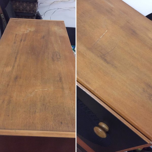 A fiók alumínium fogantyúit meghagytam mert illett a tapéta ezüst mintájához. Szerettem volna több natúr fa részt hagyni, de a keret és egy fiók bőven kiegészítette az összképet. Ezeket vörösfenyő olajjal töröltem át, így eltűntek az apróbb karcok, repedések hibák a szem elől. 😎 Itt nem használtam fagittet, mivel az olajlakk nem fedi el azt, inkább ápol és lezárja a fa pórusait, vízhatlanít. Utolsó mozzanatként jöhetett a komód “koronája” a két ajtó fogantyúja. Eddig ugyanis kulcsos zárral volt nyitható ami el volt törve, cserélni nem akartam, helyette helyes fa gombokat adtam rájuk. A kicsi tolózárat belül viszont meghagytam rajta.