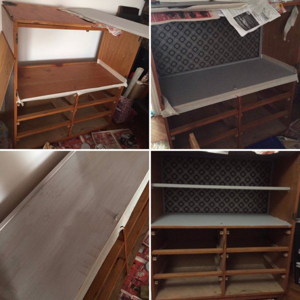Persze az alap tisztítás, kézi csiszolás, portalanítás és zsírtalanítás után természetesen.A szekrény belseje szürke lett fent és alul, mint a polca amit kicseréltem szélesebbre, használhatóbbra, mivel én nem konyakos pohárkákat akartam benne tartani. 😇